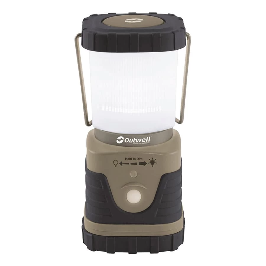 Die Outwell Carnelian Laternenlampe DC 350 lm hat einen Tragegriff, mit dem Sie sie an jeden beliebigen Ankerpunkt hängen können. Halten Sie die Taste gedrückt, um das Licht zu dimmen. Integrierter Lichtdimmer 10-100%. Interne wiederaufladbare Batterie – 230 V (Adapter im Lieferumfang enthalten).