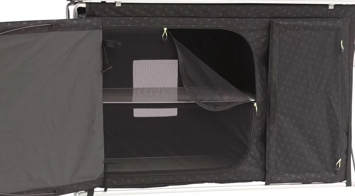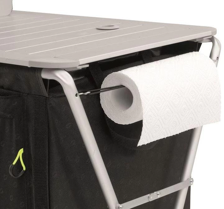 Der durchdachte Küchentisch Richmond zeichnet sich durch ein stabiles Aluminiumgestell und einen schwarzen Bezug mit Prägemuster aus. Die Tischplatte besteht ebenfalls aus Aluminium. Der Küchentisch Richmond umfasst ein zusammenklappbares Waschbecken, das über die Tischplatte leicht zugänglich ist.