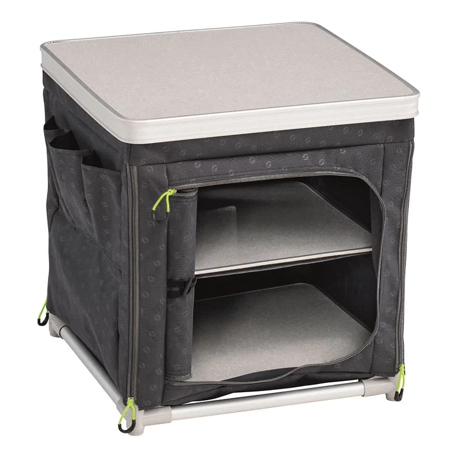 Der Outwell Tinos Klappschrank mit zwei Regalböden, Reißverschlusstür und Netzbelüftung verfügt über eine Rolltür für permanenten Zugang. Er lässt sich in Sekundenschnelle öffnen und zusammenklappen, verfügt über drei Taschen auf jeder Schrankseite für kleine Gegenstände wie Schlüssel und Mobiltelefon und umfasst eine Tragetasche zur einfachen Aufbewahrung und Tragbarkeit.